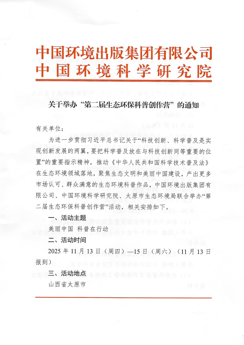 創(chuàng)作營期間,主辦方中國環(huán)境出版集團(tuán)將發(fā)布“科普作品招募計(jì)劃”,與創(chuàng)作者攜手產(chǎn)出更多市場(chǎng)認(rèn)可、群眾滿意的生態(tài)環(huán)境科普作品。